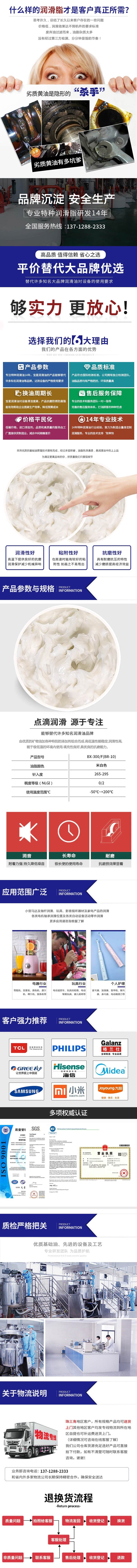 多用途食品级防水润滑脂,由优质的矿物油加各种特别的添加剂组合而成.高低温性能稳定,润滑性高,适用于各类橡胶或是塑料.用于轴承及塑料齿轮、精密零件和防水橡胶圈等位置都有良好的表现.能于极低温的环境内使用.填充性良好,具优良的抗磨能力。食品级多用途消音润滑脂BX-435系列