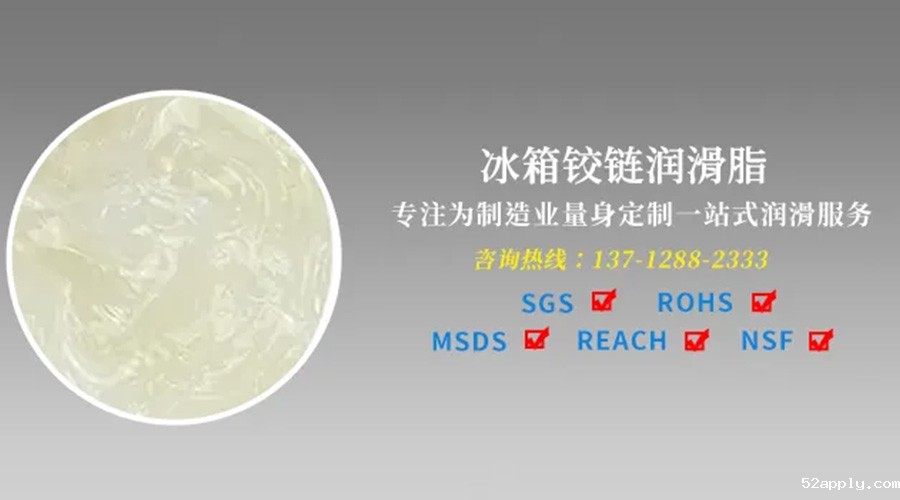 而每个冰箱都需要利用铰链将冰箱门也冰箱进行连接,铰链转轴处,牵引着冰箱门柜的运动。在冰箱门不停开合的过程中,冰箱的底部与铰链会产生摩擦,摩擦过大时,就会发出异常的声音,所以,我们需要在铰链的转轴处加入合适的食品级低温润滑脂,用来起到一个消音润滑的作用。