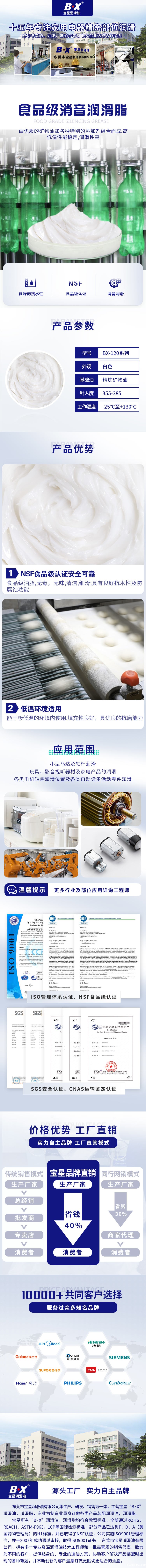 食品级消音润滑脂BX-120系列,采用全合成的高温复合铝基稠化剂加多种抗压、抗磨、防水添加剂组合而成,具良好的填充性及高润滑性能。使用温度宽广,高低温性能稳定,可承受高负荷及高冲击力,低电阻抗,也适用于各类开关触点的润滑及防氧化保护开关电镀表层,减少氧化及磨损。适用于各类软胶与硬胶,防水性良好。