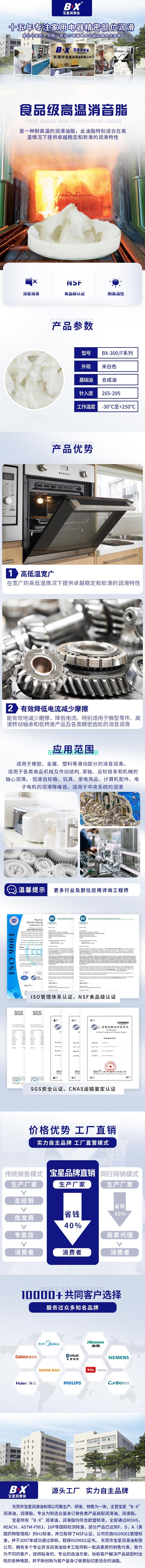 食品级高温消音脂BX-300系列,是一种耐高温的润滑油脂。此油脂特别适合在宽广的高低温情况下提供卓越稳定和软滑的润滑特性。