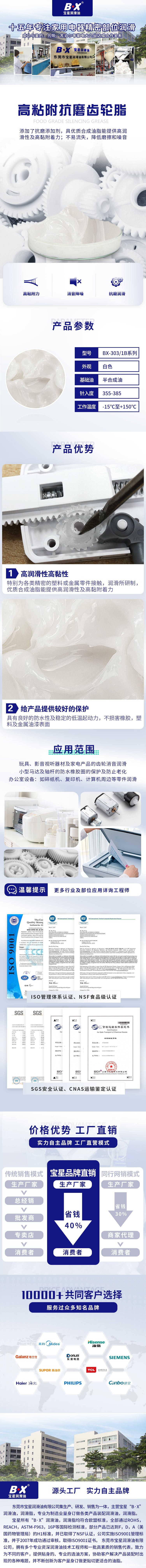 高粘附抗磨齿轮脂BX-303系列,是特别为各类精密的塑料或金属零件接触,润滑所研制,添加了抗磨添加剂,具优质合成油脂能提供高润滑性及高黏附着力;不易流失,降低磨擦和噪音。适用于中,小型马达及精密齿轮部件,具良好的高低温性能。