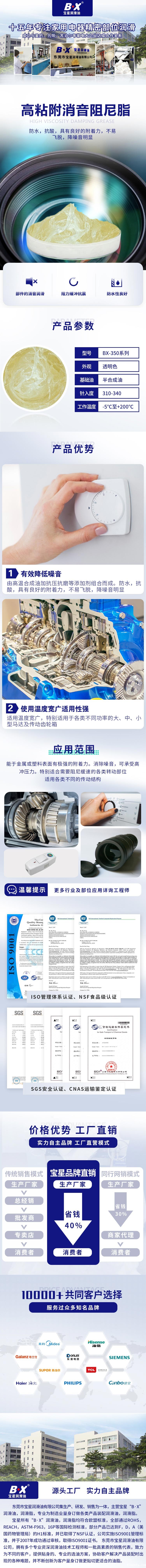 高粘附消音阻尼脂BX-350系列,是由高温合成油加抗压抗磨等添加剂组合而成。防水,抗酸,具有良好的附着力,不易飞脱,降噪音明显。特别适用于各类不同功率的大、中、小型马达及传动齿轮箱。适用温度宽广。