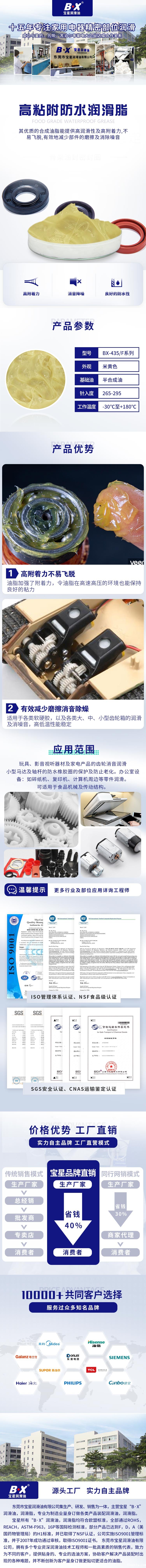 高粘附防水润滑脂BX-435系列由优质的抗磨添加剂加合成油组合而成,油脂加强了附着力,令油脂在高速高压的环境下也能保持良好的粘力,适合于各类大、中、小型齿轮箱的润滑及消噪音,高低温性能稳定,防水润滑好!