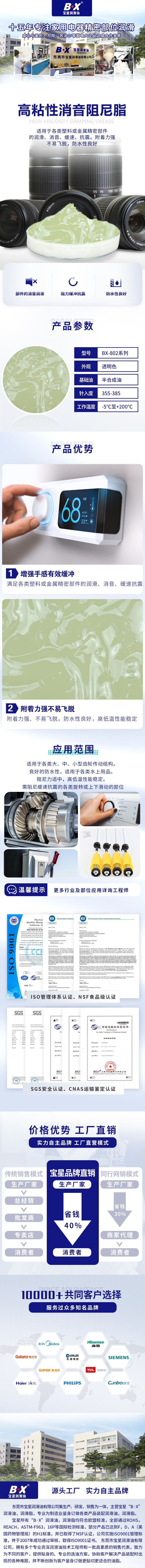 高沾性消音阻尼脂BX-802系列,是由优质合成油与精炼矿物油加抗压抗磨等添加剂组合而成。防水,抗酸,具有良好的附着力,不易飞脱,降噪音明显。特别适用于各类不同功率的大、中、小型马达及传动齿轮箱。适用温度宽广。