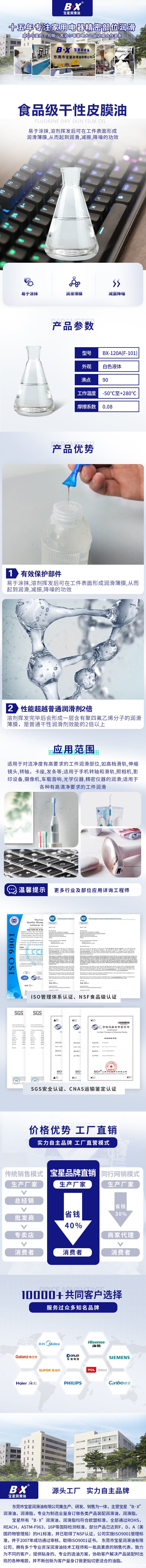 食品级干性皮膜油BX-120/A系列,易于涂抹,溶剂挥发后可在工件表面形成润滑薄膜,从而起到润滑,减振,降噪的功效。F-101是一种含有聚四氟乙烯固体润滑颗粒的润滑剂,溶剂挥发完毕后会形成一层含有聚四氟乙烯分子的润滑薄膜,是普通干性润滑剂效能的2倍以上。