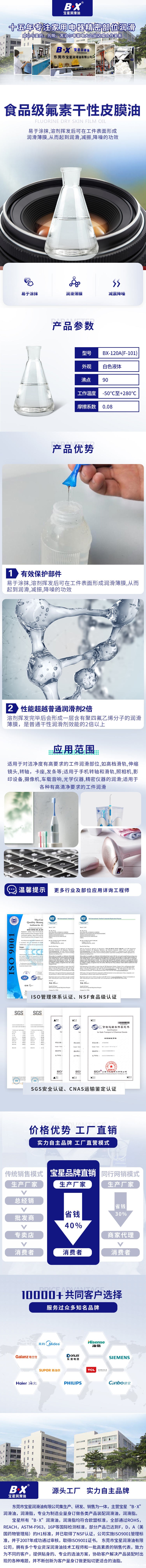 食品级氟素干性皮膜油BX-120/A系列,食品级氟素干性皮膜油BX-120/A系列,易于涂抹,溶剂挥发后可在工件表面形成润滑薄膜,从而起到润滑,减振,降噪的功效。F-101是一种含有聚四氟乙烯固体润滑颗粒的润滑剂,溶剂挥发完毕后会形成一层含有聚四氟乙烯分子的润滑薄膜,是普通干性润滑剂效能的2倍以上。