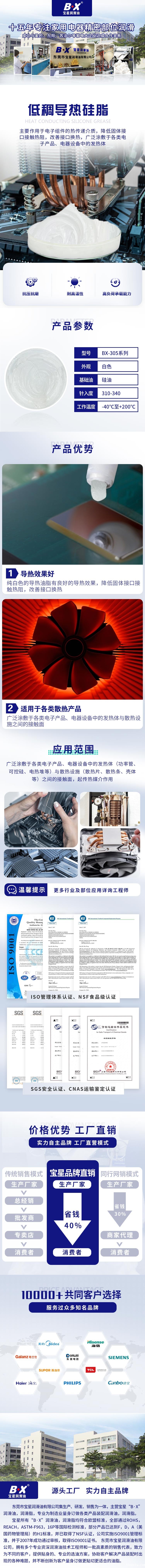 低稠导热硅脂BX-305系列,纯白色的导热油脂有良好的导热效果,主要作用于电子组件的热传递介质,降低固体接口接触热阻,改善接口换热,广泛涂敷于各类电子产品、电器设备中的发热体(功率管、可控硅、电热堆等)与散热设施(散热片、散热条、壳体等)之间的接触面,起传热媒介作用。可以提高导热速度,增加发热体的敏感度,瞬间温度可到300℃ 以内。适用温度范围-50℃至+280℃,符合美国环保ROHS标准及REACH标准。