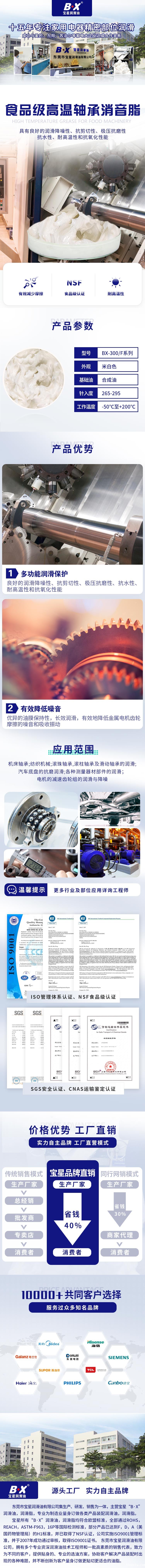 食品级高温轴承润滑脂BX-300系列,是一种以复合钡皂为稠化剂的多用途润滑脂,本产品具有良好的润滑降噪性、抗剪切性、极压抗磨性、抗水性、耐高温性和抗氧化性能,广泛用于各种纺织行业轴承以及电机齿轮、车用门锁部件、以及汽车底盘的降噪与润滑