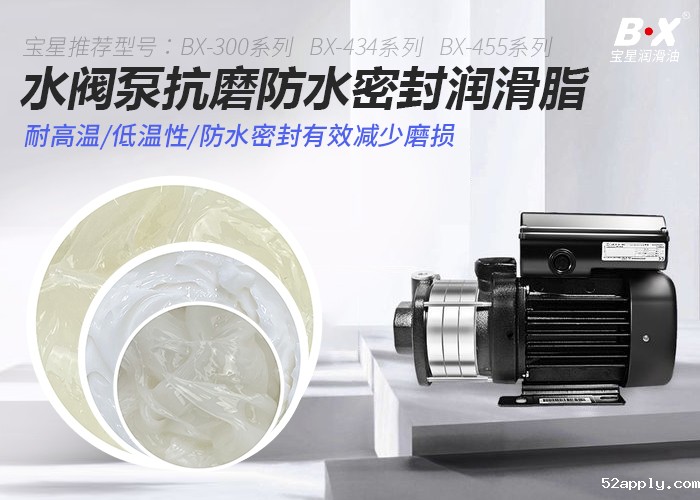 52apply防水密封润滑脂有BX-434系列,BX-455系列,BX-602系列,BX-800系列,BX-120/A系列,是特别为各类精密的塑料或金属零件接触,润滑所研制,其优质合成油脂能提供高润滑性及高黏附着力;不易流失,降低磨擦和噪音。适用于中、小型马达及精密齿轮部件。有良好的防水性及稳定的低温起动力。