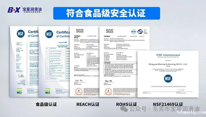 食品级安全:符合NSF H1认证以及欧盟ROHS、REACH环保标准。